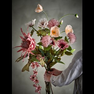 Dust buketten från Bloomingville är en bukett med fylliga blommor i mjuka rosatoner och gröna blad. Buketten är inslagen i brunt papper och knuten med snöre. Endast för dekoration, bör inte utsättas för vatten.