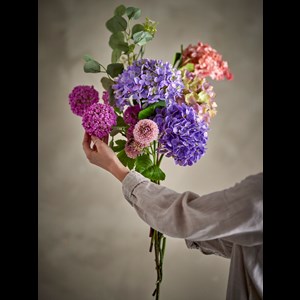 Edge buketten från Bloomingville är en dekorativ bukett med mjuka lila nyanser, fina rosa och ljusgula accenter, vackert kompletterad med djupgröna blad och eucalyptus. Den är inslagen i brunt papper. Endast för dekoration, bör inte utsättas för vatten.