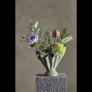 Whisper buketten från Bloomingville har med sina dämpade lila och gröna färger en känsla av att viska tyst mot skymningshimlen. Det är ett förfinat arrangemang som verkar berätta en historia om stilla ögonblick och mild skönhet. Som en viskning förmedlar den en känsla av ro och tystnad, precis som den dämpade atmosfären under skymningen, när världen tycks sakta ner och tala i mjuka toner. Innan användning kan du med fördel forma stjälkarna för att framhäva bukettens naturliga utseende och anpassa den efter din personliga inredning. Levereras i papper. Vas ingår ej. Endast för dekoration, bör inte utsättas för vatten.