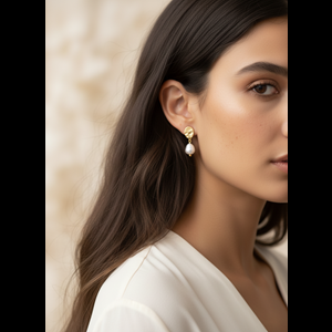 Unika och eleganta örhängen i guldfärgad metall och en pärla.