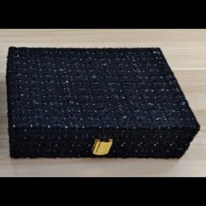 Liten smyckeskrin med svart textil och guldspänne, perfekt för förvaring av dina smycken.