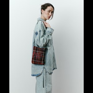 Den här crossbodyn är gjord i ett färgglatt boucletyg som ger en vacker och taktil yta. Den praktiska inredningen inuti består av både dragkedjeficka och öppen ficka, och väskan stängs med en dold dragkedja. Den justerbara remmen i imitationläder har ett fint bältespänne, och väskans konstruktion gör det möjligt att bära den både horisontellt och vertikalt för ett unikt uttryck.