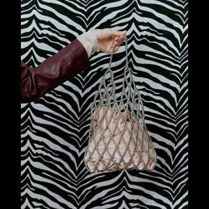 En lätt och dekorativ väska som sticker ut med sin nätstruktur gjord av pärlor i metallutseende. Den inre påsen i mjuk velour stängs med snöre och rymmer det viktigaste. Väskan kan bäras både i handen och över axeln – perfekt för festliga tillfällen eller som ett blickfång i vardagen.