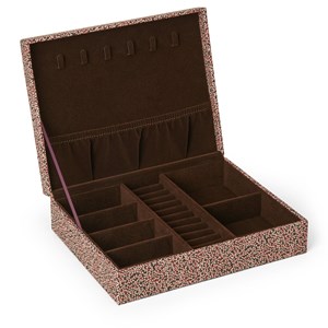 Ett stort och funktionellt smyckeskrin med plats för hela samlingen. De många facken gör det enkelt att organisera smycken, och locket har krokar för halsband. Det är gjort i ett fint blommönster och har magnetstängning.