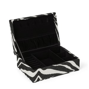 Detta mellanstora smyckeskrin rymmer det mesta – med flera fack och krokar för halsband. Det jacquardvävda yttre med zebramönster, mjuk svart velour invändigt och den magnetiska stängningen ger ett både funktionellt och stilfullt uttryck.