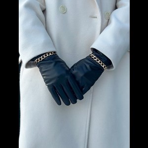 Vacker handske i mjukt och läckert lammskinn. Handsken har ett enkelt och stilrent utseende, och är dekorerad med en guldkedja på framsidan. Läderhandsken har touchfunktion i pekfinger och tumme. Fodret på handskarna matchar färgen på läderhandsken. Foder 70% ull / 30% akryl.