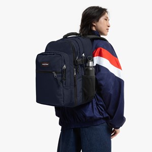 Tutor ryggsäck från Eastpak. Ryggsäcken är utrustad med två stora fack och två mindre fack framtill med dragkedjor. Ryggsäcken kan utvidgas vid behov och har kompressionsremmar på var sida. På ryggsäckens sida finns en åtkomst till en vadderad ficka med plats för en 16" PC eller 15" MacBook Pro. Det finns interna fickor för mobiltelefon, nycklar och pennor, och på sidan av ryggsäcken finns en nätficka för vattenflaska. Väskan har en bröstrem och justerbara axelremmar.
