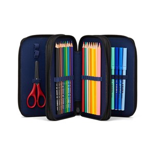 Ergobag Maxi 3-delat pennfodral med innehåll - 40 delar. Innehåller färgpennor, penna, linjal, sax och suddgummi från Osiris-serien från det tyska märket LYRA. Ergobag pennfodral använder textilier gjorda av 100 % återvunna PET-flaskor.