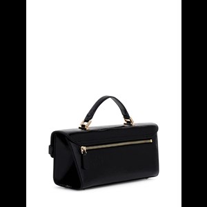 Elegant handväska med glansig yta och markerade metalldetaljer. Väskan har ett enkelt topphandtag, dragkedjeficka på baksidan och rymligt huvudfack med lockstängning.