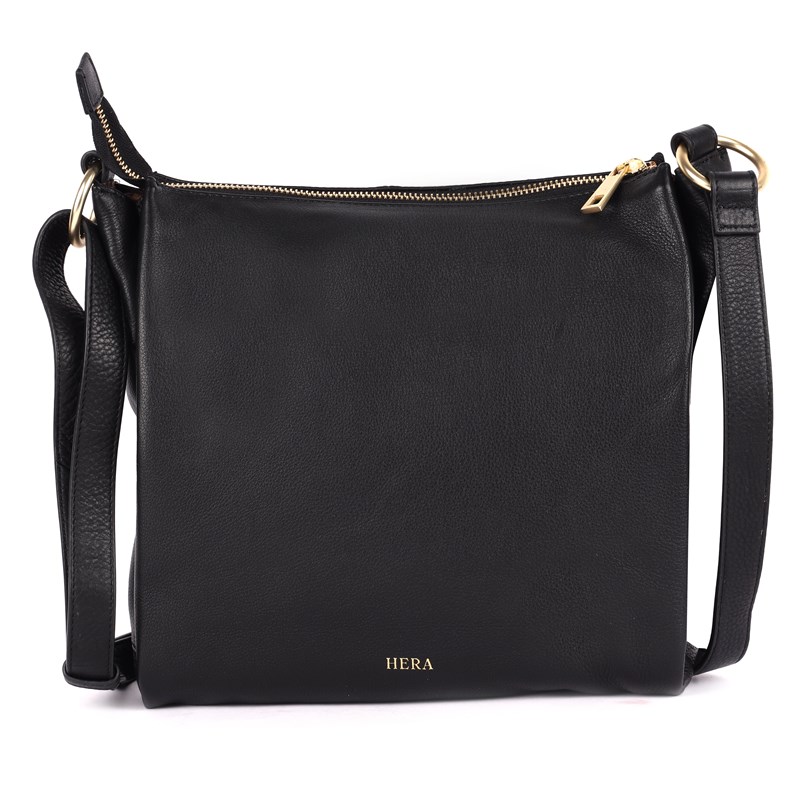 Maja axelväska från Hera. Klassisk axelväska med vackra och enkla guldbeslag. Väskan stängs upptill med blixtlås. Invändigt finns möjlighet att organisera dina saker då väskan har två fack uppdelade av en smal blixtlåsficka. Det finns ytterligare en smal blixtlåsficka på ena sidan av fodret. Väskan har en lång justerbar rem.