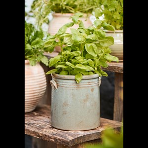 Keramikkruka med diskreta öron och en yta full av karaktär. Den taktila glasyren ger ett levande uttryck och gör den lika vacker för växter som för redskap i köket eller i kreativa verkstaden.