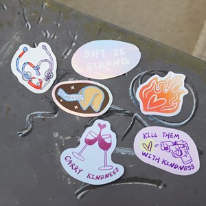 STACY sticker pack består av ett set med sex stansade vinyldekaler, som alla är designade för att påminna dig om att bära vänlighet med dig och möta andra med ett öppet hjärta.