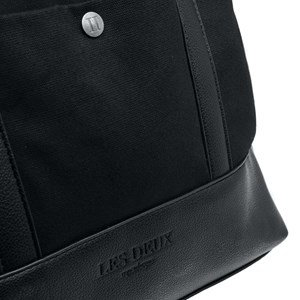 Ryggsäck i canvas med ram i veganskt läder och tryckknapp på framsidan.