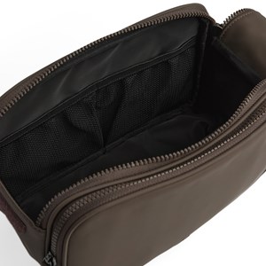 Journey Toilettväska i gummi från Markberg är den perfekta necessären för din resa. Necessären är tillverkad i 100 % återvunnen polyester, både i ytter- och innermaterial. Den har ett snyggt gummilook som ger den ett mer mångsidigt och sportigt utseende, och den är unisex. Necessären har ett framfack samt ett stort huvudfack som öppnas och stängs med två blixtlås och kardborre på sidan. Totalt har den tre blixtlåslösa. Necessären har ett handtag så att den kan bäras i handen. I det smala framfacket finns en nätficka med blixtlås på sidan. I det stora facket finns också två öppna nätfickor. Necessärens mått är 15 cm x 25 cm x 13 cm.