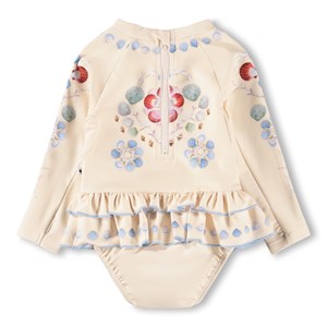 En bekväm baddräkt för de minsta, prydd med söta snäckor och fina volanger. Den har långa raglanärmar och en praktisk dragkedja på ryggen som gör påklädningen enkel. Tryckknappar i grenen underlättar blöjbyten, medan det nedre foderet med elastik skapar en perfekt passform. Idealisk för soliga dagar vid stranden eller vid poolen.