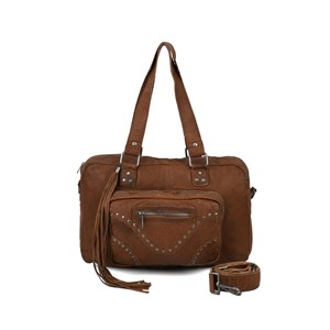 Mille-väskan i kalvskinn stängs med dragkedja och har både ett stort fack och en mindre ficka framtill. Den har en lång, justerbar och avtagbar rem. Väskan är dekorerad med nitar på framsidan och har en lång lädertofs.