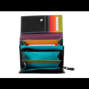 Klassisk och stilfull plånbok från Pia Ries i mjukt kalvskinn med turkosa sömmar. Plånboken öppnas med tryckknapp (justerbar) och rymmer både ett stort sedelfack, ett tvådelat myntfack med dragkedja samt flera praktiska fack för kort och kvitton. Totalt finns plats för 11 kort, och naturligtvis är alla fack utrustade med RFID-skydd.