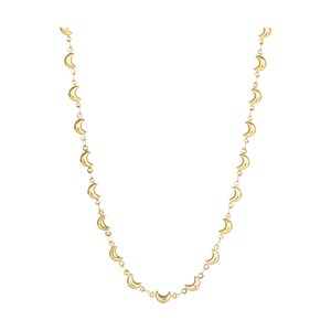 Ett dekorativt halsband med små måneformade länkar som skapar en lekfull och iögonfallande look. De upprepade formerna skapar en vacker rytm i designen och tillför en lätt, feminin touch som faller vackert runt halsen. Halsbandet kan bäras ensamt som ett fint blickfång eller kombineras med andra kedjor för en mer personlig look. Ett smycke som passar både till vardags och till fest.