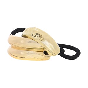 Denna uppsättning med två elastiska hårband kombinerar funktion och stil i ett. De dekorativa metalldelarna har en mjuk, organisk design med en lätt strukturerad yta, vilket ger dem ett modernt och exklusivt utseende. De kan användas till uppsättningar, hästsvansar eller som ett snyggt armband runt handleden när de inte används.