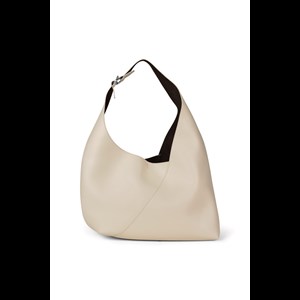 Axelväska med böjd axelrem. Stängning med stängningsmekanism på insidan. Metallbeslag i form av den ikoniska ön på axelremmen. Ficka med logotyp på insidan. Silverfärgade metallbeslag. Huvudmaterial tillverkat av återvunnet läder.