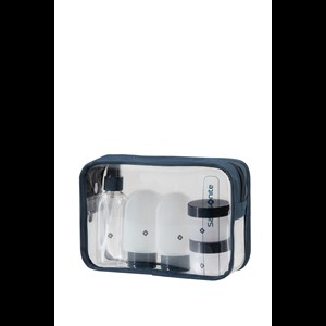 Reseset från Samsonite med flaska, tuber och burkar, så att du snabbt kommer igenom säkerhetskontrollen.