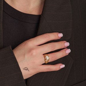 Designen är inspirerad av klara vintermorgnar. Pärlan symboliserar snön och är placerad på en rå ringskena med textur som ger ett feminint och kontrastfullt uttryck. Bär ringen ensam som ett statement, stapla med andra guldbelagda ringar, eller kombinera med Perma-örhängena för en tidlös look.