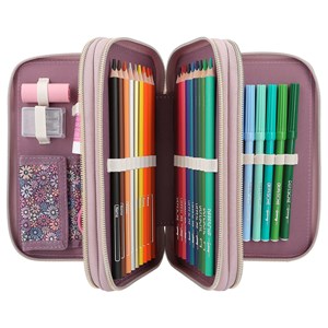 Härligt pennfodral från serien Miss Melody Flower Field med ett vackert hästmotiv samt ordet Love broderat på framsidan samt fina blommiga all-over-print-detaljer. Pennskrinet är uppdelat i tre stora rum och är fyllt med allt du behöver för att rita och skriva med både i skolan och hemma. Innehåller sax, linjal, lim, suddgummi, vässare, två pennor, 18 kritor, 18 tuschpennor och mycket mer.