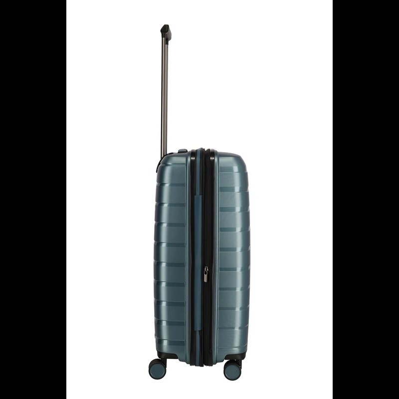 Travelite Air Base hardcase är extra snyggt. Samspelet mellan den släta och råa ytan i trendiga färger gör utseendet helt unikt – det finns ingen risk att förväxla din resväska med den solida massan av andra resväskor på bagagebandet på flygplatsen. Det robusta polypropenmaterialet gör Air Base-resväskans hårda fodral reptåligt och nästan oförstörbart, och den är därför idealisk för dig som flyger mycket. Air Base-resväskan kan transporteras på de fyra lättgående dubbelhjulen och i bara en hand på alla ytor, tack vare den stabila, fixerbara teleskopstången, så det är bekvämt att dra och skjuta i alla riktningar. Det integrerade TSA-låset säkrar också ditt bagage på resan – särskilt om du reser till USA. Under bagagekontrollen kan säkerhetspersonalen öppna låset utan skador med hjälp av en huvudnyckel och stänga det igen utan problem. Med Air Base resväska är du optimalt utrustad på dina resor, då serien har en stilren exteriör och genomtänkt funktionalitet inuti. Och om du plötsligt behöver mer förvaringsutrymme kan du enkelt och snabbt utöka förvaringsfacket på vagnen i storlek M AIR BASE tack vare den inbyggda stretchvikningen. Den genomtänkta interiören har kvalitetsfoder. De dubbelsidiga elastiska packremmarna och packväggarna med extra fickor med dragkedja ger en perfekt överblick. Resväskan är 67 cm hög, har en volym på 71/82 liter och väger 3,2 kg.
