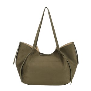 Modern kasse med två bärhandtag som kan bäras över axeln. Väskan stängs i mitten med en tryckknapp och har ett invändigt hängande fack för mindre tillhörigheter